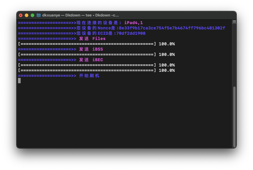4,输入数字1,开始进入Pwndfu模式,成功就进行下一步,如果失败,重新进DFU来过。