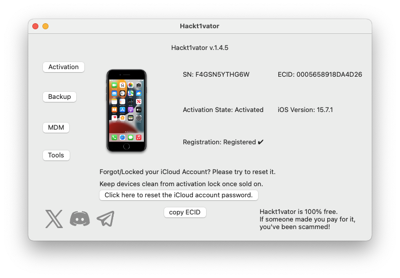 Hackt1vator Unlock是一款Mac电脑上的软件,只支持MacOS系统。它可以帮助因为忘记iCloud账号密码而无法使用的iPhone、iPad。还可以跳过MDM配置锁,是一款非常实用的工具。而且,重点是免费的。