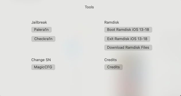 2,点左下角Tools,选择两种方式来加载环境:越狱JailBreak或者虚拟磁盘Ramdisk