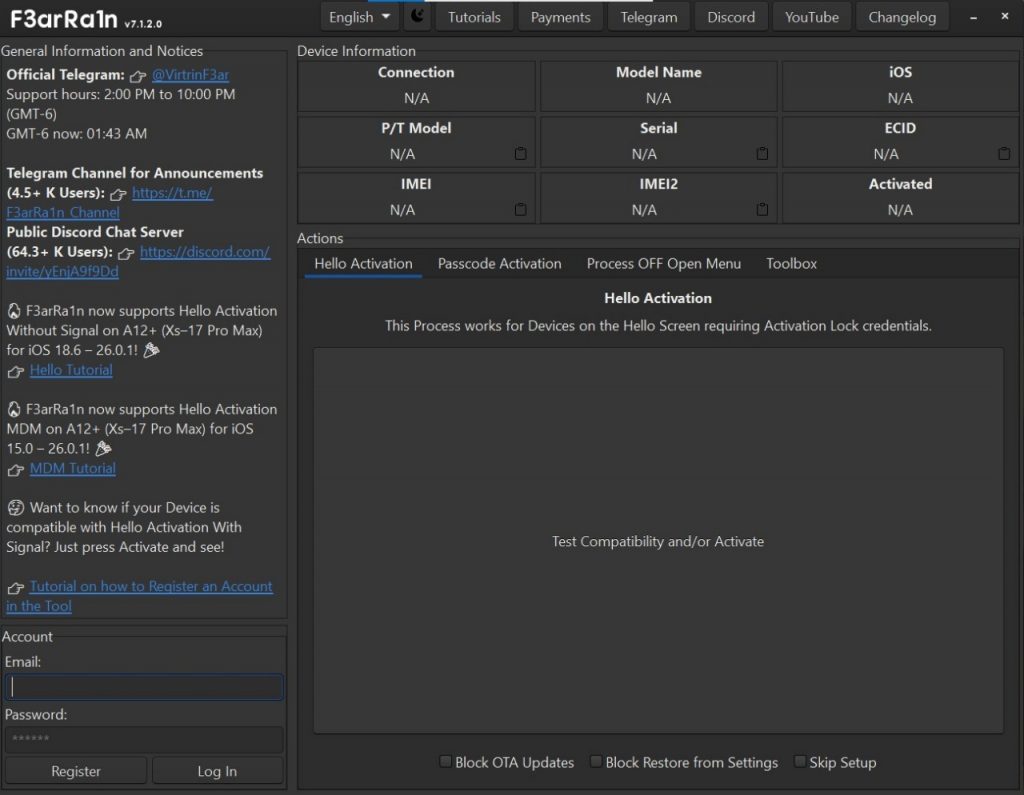 F3arRa1n是一款iCloud bypass的软件,适用于忘记iCloud账号密码而无法激活的设备,是一款由墨西哥开发人员发布的软件,分为收费和免费功能。如果您因为不小心刷机或者还原,而无法激活iOS设备,那么这个软件可以帮助您你跳过激活界面,让你的设备可以连接WiFi使用。