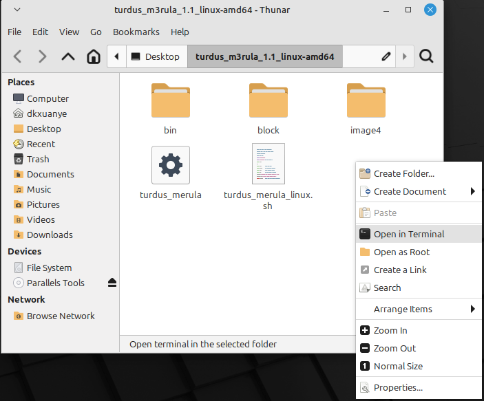 3,启动Linux系统,找到存放降级工具的磁盘目录,打开turdus merula文件夹,在空白的地方,点鼠标右键,选择OpeninTerminal
