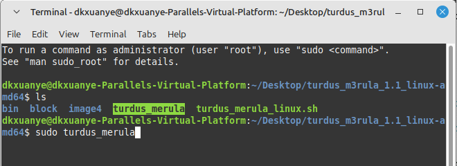 第二条命令:sudo turdus_merula (按回车键继续)