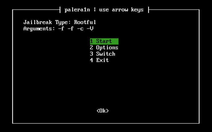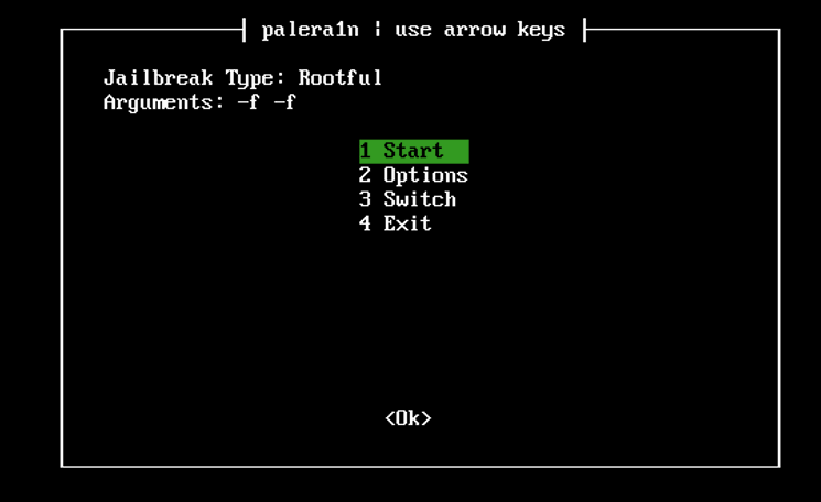 6,重启完成后,iOS设备进入系统,重新电脑,选择U盘启动,再次来到越狱工具界面,选择1 palera1n,然后直接选择1 Start 开始进入第二阶段越狱。(这次不需要选择Options)