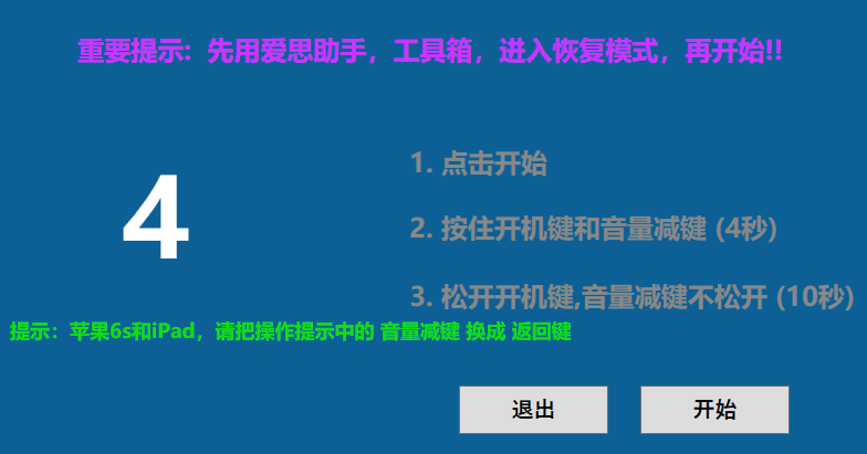 5,点击 引导到DFU模式,点击开始,按照提示操作按钮,操作设备进入DFU模式。引导成功之后,点击退出按钮。DFU模式:屏幕是黑的,从爱思助手上能看出来!注意:区分iPhone6s\6sp\se的按钮区别。